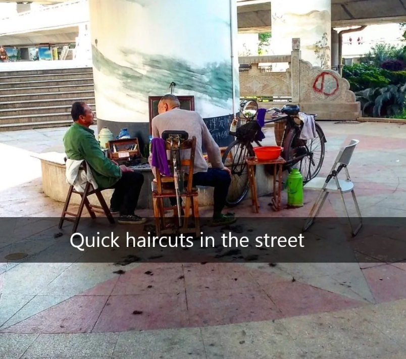 Na China, há barbeiros espalhados por toda a cidade em muitas esquinas, e os habitantes locais estão satisfeitos com estes serviços.