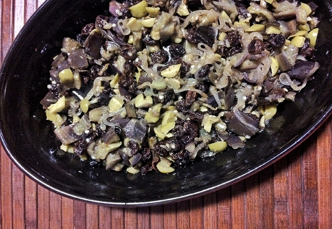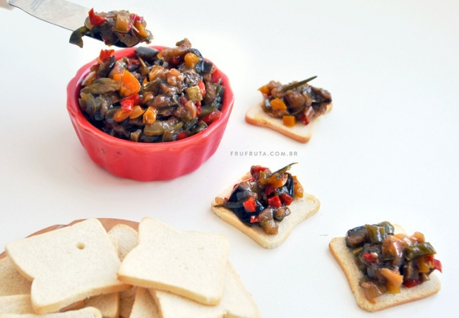 Também chamada de caponata, essa receita é uma das mais incrementadas. Além da berinjela, leva ingredientes como abobrinha, as três cores de pimentão, salsão, cebola, tomilho, alho, passas, alcaparras, azeite, azeitona preta, azeite balsâmico, sal e pimenta. É uma explosão de sabores e texturas para o paladar.