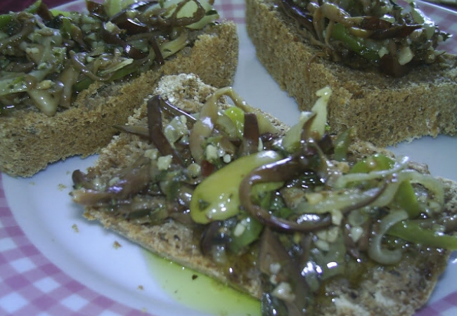 Essa é uma versão mais prática da receita, bem colorida e apetitosa. Mais incrementada do que a anterior, leva duas variedades de pimentão ao seu gosto. Também é feita com azeitonas, alho, cebola, passas, orégano, vinagre, azeite, sal, pimenta, manjericão e tomilho. Uma riqueza de sabores.