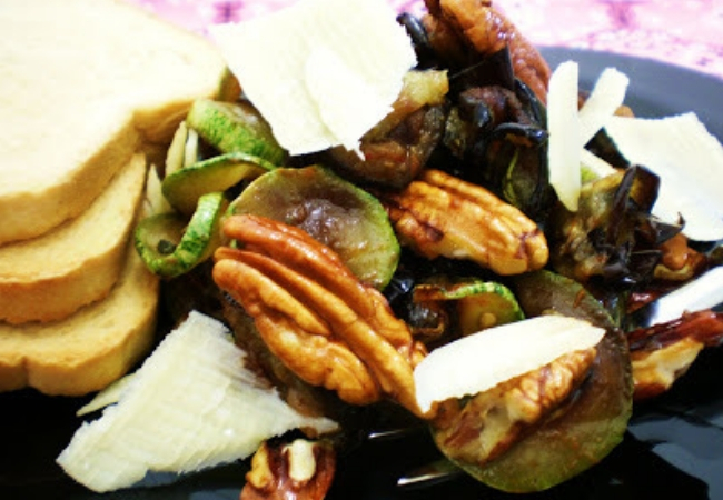 Nessa versão tem mais uma combinação de sabores diferentes. Essa é especial para quem gosta de molho de soja, molho inglês, pimenta chili, manjericão, alecrim e queijo parmesão, que é usado em lascas. Além disso também vai tomate pelado, azeite aromático, abobrinha e, claro, as nozes pecã. Experimente!