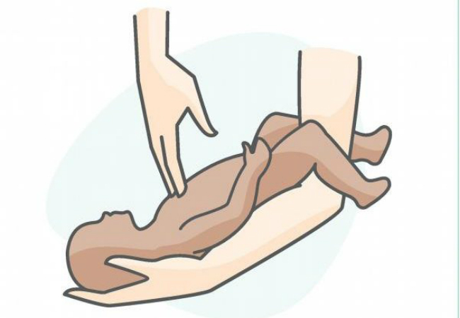 Se é necessário que você interfira fisicamente para desobstruir as vias aéreas do bebê, comece o dando batidas nas costas. Antes posicione o pequeno deitado de bruços no seu antebraço, usando os seus dedos para sustentar a mandíbula do bebê no lugar. Então aproxime o seu antebraço da coxa e use o peito da sua mão para dar cinco batidas firmes no meio das omoplatas.