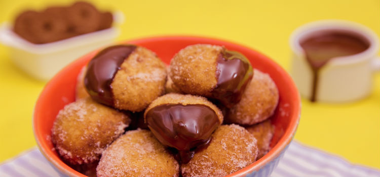 - Frite os bolinhos até ficarem douradinhos e escorra-os bem. Sirva com creme de avelã e chocolate, fica uma delícia!