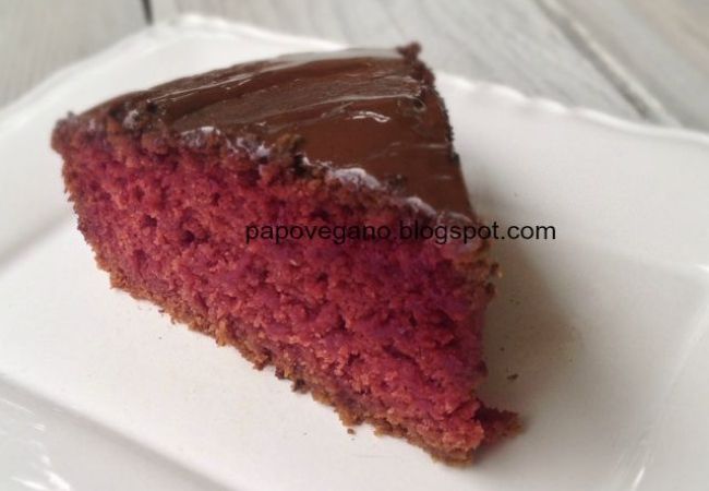 Se você busca por opções veganas desse bolo, essa é uma delas. A massa é feita com farinha de trigo que pode ser integral ou não, açúcar demerara, essência de baunilha, beterraba ralada, óleo, vinagre de maçã, fermento, leite de soja sem sabor e chocolate vegano.