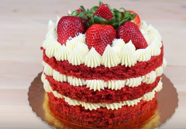 Veja como faz toda diferença caprichar no visual do bolo, cuidando com a espessura das camadas e o modo de espalhar a cobertura. O detalhe dos morangos também deixou o bolo muito mais apetitoso. Essa versão tem um recheio que leva cream cheese, açúcar de confeiteiro, manteiga, aroma de baunilha e raspas de limão.