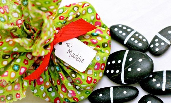 Você precisa de 28 pedras, pincel e tinta branca para fazer seu próprio dominó, e se quiser presentear alguém com o brinquedo basta fazer um belo saquinho com retalhos de tecido e fita de cetim para fechar.