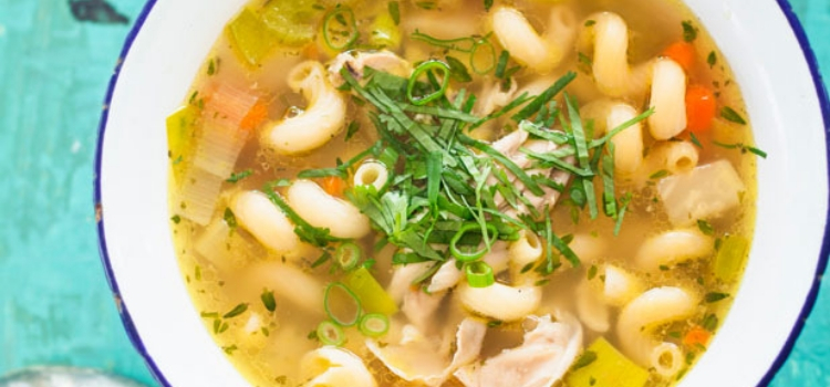 Nessa versão da receita, além do frango, da cebola, da cenoura e da massa, também usa-se alho-poró, que deixa o sabor suave, além de tomilho e alecrim para que o sabor e o aroma fiquem ainda melhores.
