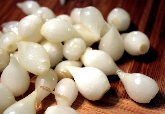 A menor de todas é essa cebolinha chamada de pérola ou bebê. É muito usada para conservas, seu sabor é suave, dá para comer pura como petisco. Pode adicionar nas saladas ou em cozidos, inteiras mesmo, pois são muito pequenas.