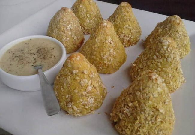 Como você pode perceber pela imagem, essa coxinha de mandioca é integral, preparada com aveia em flocos que é mais rica em fibras do que a farinha de aveia. Então, se você deseja regular a sua dieta e gerar saciedade, para manter o deficit calórico, essa receita é ideal. Por isso, confira como fazer essa coxinha.