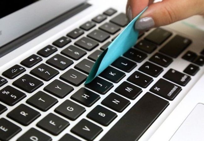 Se você não tem um aspirador miniatura para limpar peças pequenas, pode remover a poeira e os farelos entre as teclas do seu teclado usando fita adesiva. Com o computador desligado, dobre um pedaço de fita com o adesivo para fora e vá captando a sujeira com a cola do adesivo.