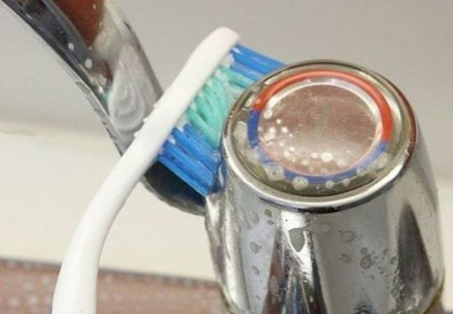 É normal que as torneiras acumulem manchas de água e manchas pretas de limo em suas bordas. A melhor aliada para remover todo o limo e deixar a torneira como nova é a escova de dentes velha. Vá umedecendo a escova em uma misturinha de água morna e detergente, e passando em toda a torneira. Depois é só enxaguar e secar.