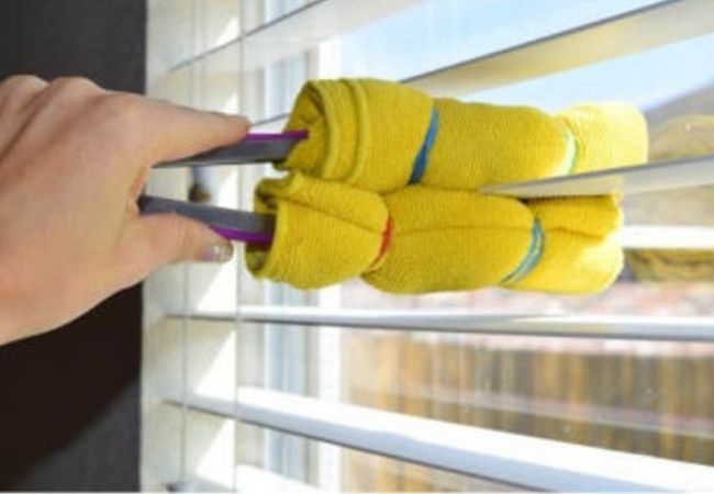 O lado ruim das persianas de PVC é na hora de limpar, pois precisa fazer isso em cada uma das lâminas. Se você tiver uma pinça culinária em casa, basta envolver cada uma das partes do pegador com um paninho de limpeza umedecido e prender com elástico.