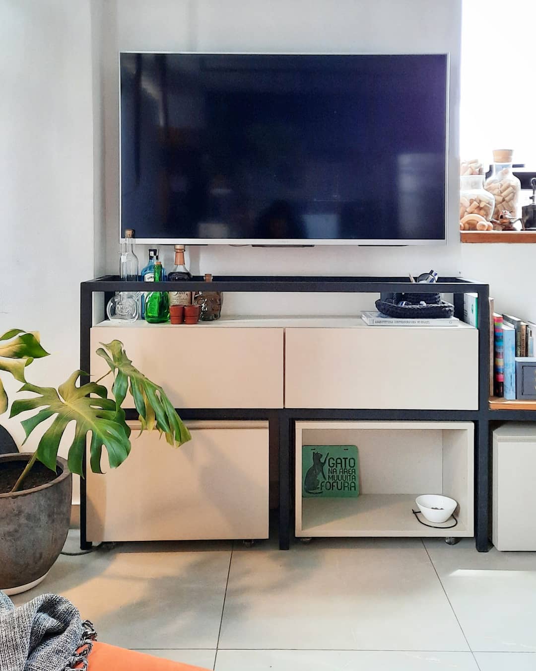 Não quer uma estante alta que ocupe toda a parede? Então escolha um rack baixo que ocupa menos espaço e é mais prático.