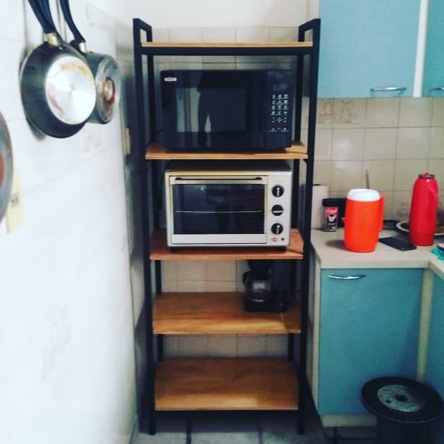 Pensou que só ficava bom na sala? Essa estante é prática e ficou perfeita servido de torre para eletros.