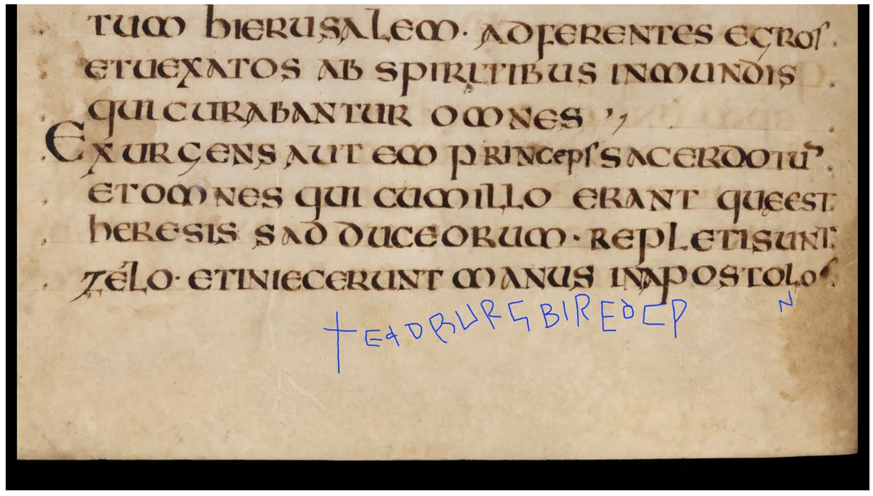 O primeiro símbolo era uma cruz, seguida por “Eadburg”: quase certamente o nome do dono do livro. Uma análise mais aprofundada revelou que havia sido riscado deliberadamente com algum tipo de caneta em outras quatro páginas.