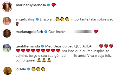 “Dia Internacional da Mulher. E eu queria falar um pouquinho sobre uma coisa que acontece comigo e acontece com você também, mulher, numa proporção diferente. Na semana passada, o fim de um relacionamento meu virou notícia. Até aí, nada de mais. Pessoas públicas passam por situações assim que são noticiadas. O que é questionável é ler o tipo de comentário: ‘Nossa, coitada da Grazi, não dá certo com ninguém’, ‘Como será que fica a filha (Sophia, de seu casamento com Cauã Reymond) dela nessa situação?’, entre outros tipos de comentários machistas muitas vezes feitos por mulheres. Fica vergonhoso esse tipo de machismo entre nós mulheres como se fosse preciso estar acompanhada de alguém, mesmo que seja uma relação falida, tóxica, para ser uma mulher bem-resolvida aos olhos dos outros. Infelizmente, conheço mulheres nessa posição, que sofrem esse tipo de relação para cumprir, aos olhos dos outros, o ideal de relacionamento. Eu acredito no amor, acredito em relacionamentos longos e maduros, conheço, me inspiro em casais assim, busco esse tipo de convivência. Acredito que o amor não tem tempo. Uma relação pode ser finalizada e os dois continuarem amigos. Hoje não acredito e não aceito nenhuma relação que não me faça feliz, que não seja de amadurecimento para os dois, de crescimento. Tive relacionamentos incríveis com pessoas maravilhosas e foi lindo. E a gente não seguiu por tantos outros motivos da vida, que esses motivos não foram sedutores para o ambiente da fofoca, de mídia, enfim.”.