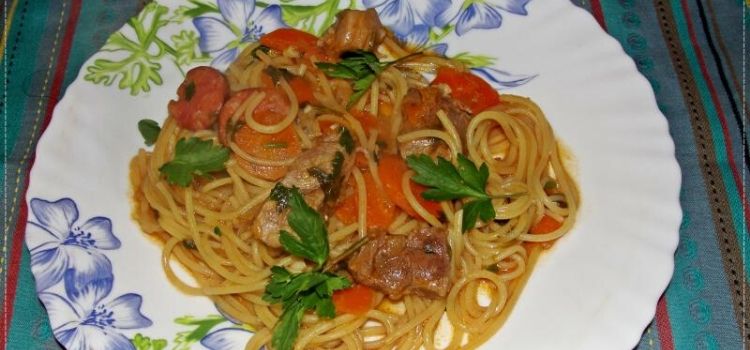 Nessa receita de guisado de porco, adaptada do Sabor Intenso, o prato já vem acompanhado com a massa para uma refeição completa.