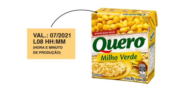 Por isso, se você comprou um milho de caixinha da Quero nos últimos dias, confira se o lote que está na embalagem é o L08 Val 07/2021, como mostra a imagem abaixo: