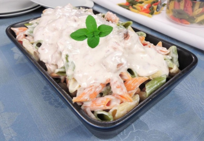 Se quiser, essa é uma receita que pode ser servida fria, como uma maionese de macarrão, pois fica ótima geladinha. A receita do molho leva o atum, a maionese, extrato de tomate, azeitona, alho, cebola, tomate, pimentão e temperos a gosto.