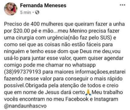 Em suas redes sociais, ela divulgou que precisava de 400 mulheres que quisessem fazer pé e mão por apenas R$20, pois assim ela conseguiria juntar o valor necessário.
