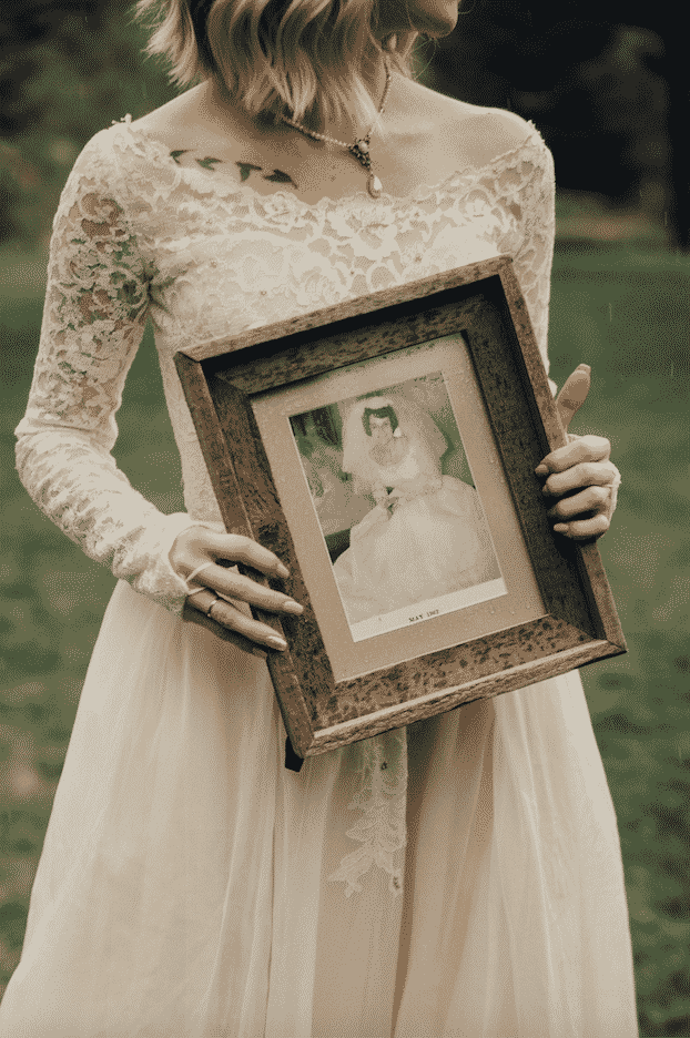 A avó se surpreendeu com o vestido da neta, que ainda segurava uma foto antiga, do casamento da avó, mostrando que realmente o vestido era o mesmo.