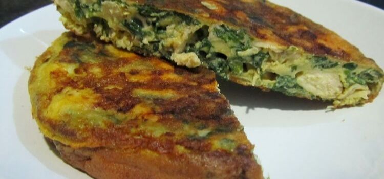 - Misture o frango e o espinafre aos ovos batidos. Coloque a mistura numa frigideira antiaderente. Doure dos dois lados.