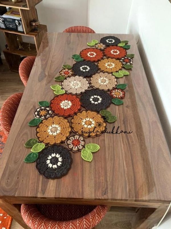 Esse modelo com flores de crochê recortadas em tons terrosos é maravilhoso para uma mesa de madeira mais escura em uma cozinha rústica.