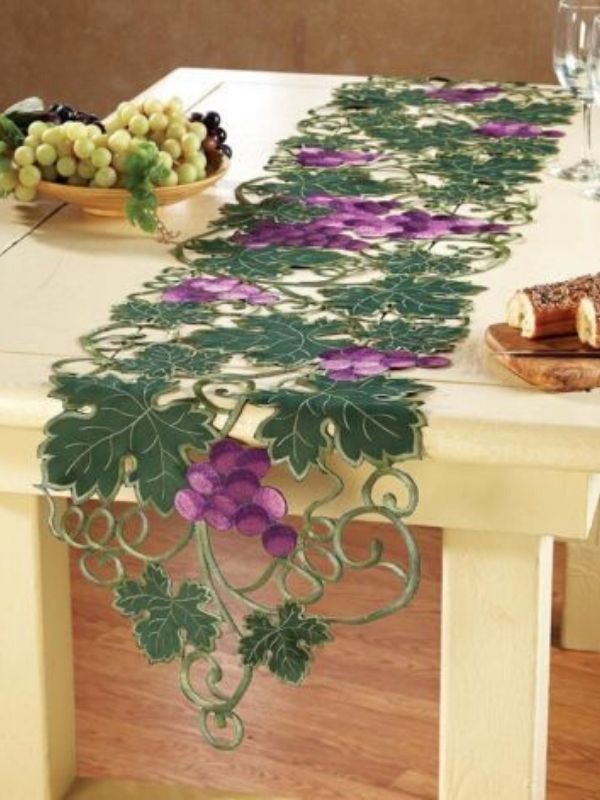 Outro modelo lindo recortado é essa passadeira de mesa em forma de um parreiral de uvas que se destaca sobre uma mesa bem clara.