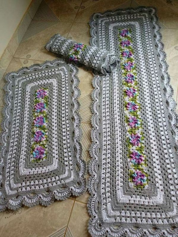 Começando pelo tradicional, esse modelo de crochê é lindo para quem gosta de ter um conjunto de tapetes na cozinha e, claro, que tem o hábito de andar com chinelos de pano dentro de casa para não sujar esse conjunto branco.