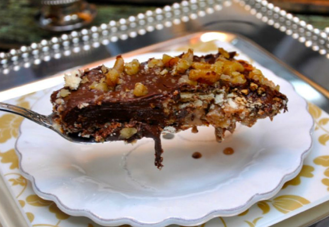 Feito com farofa de bolacha Maizena, fica maravilhoso, contrastando com a textura das nozes, do creme e da cobertura. Para isso, precisa de doce de leite, creme de leite, nozes, chocolate meio amargo, leite, chocolate em pó e biscoito Maizena.