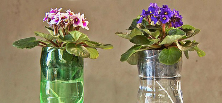 Esse sistema de rega independente é simples. Basta cortar dois tamanhos de fundo de garrafa pet, para que uma fique dentro da outra. A debaixo ficará com água e a de cima, para plantar violeta. O próximo passo é fazer furos no fundo do vasinho e passar um barbante (de pano).