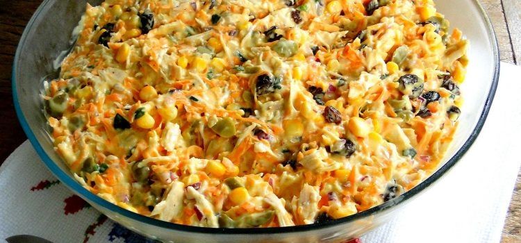 Essa receita é uma espécie de maionese de batatas, mas agridoce e com mais ingredientes para servir geladinha. É feita com frango desfiado, batatas, cenoura, passas, azeitonas, salsão, alho-poró, cheiro verde, maçã e muitos temperos. Para decorar, bastante batata palha, mas coloque só na hora de servir, para manter a crocância. Veja essa sugestão compartilhada do Mídia Max.