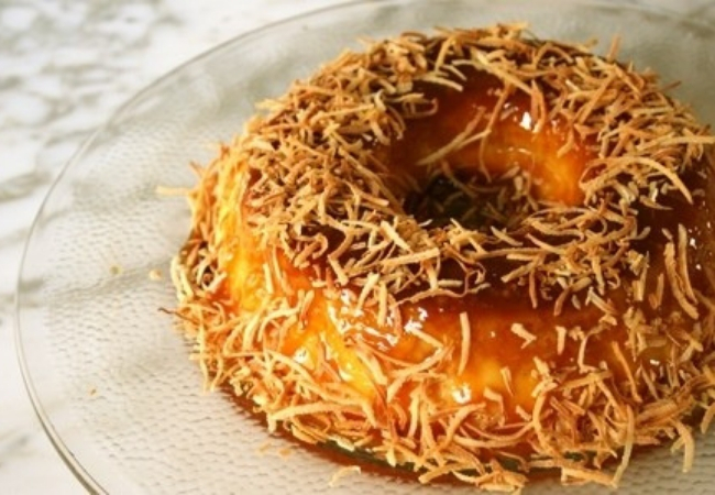 O coco queimado deixa um sabor especial nas receitas e é muito usado como decoração na cobertura porque é bonito. Ele combina muito bem com pudim e com caramelo, especialmente depois do almoço de domingo. A receita pede tapioca granulada, leite, creme de leite fresco, leite de coco, leite condensado, açúcar, ovos e água.