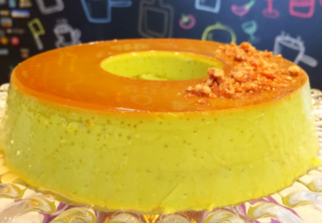 Essa é uma das oleaginosas menos usadas para receitas tradicionais, então se ainda não conhece, aproveite essa deliciosa oportunidade para experimentar. Esse pudim leva creme de leite, ovos, leite condensado, leite integral e pasta de pistache. A calda é de caramelo comum, feito com açúcar derretido em um pouco de água.