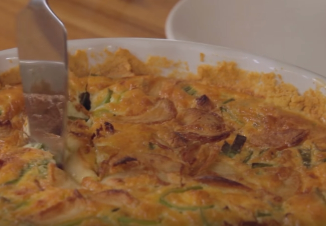 Essa receita é diferente das outras porque leva batatas cruas raladas no recheio, junto com o alho-poró, ovos, leite, alho, trigo, azeite, sal e pimenta. A massa é tradicional, com trigo, gordura vegetal, sal e água para dar o ponto certo.