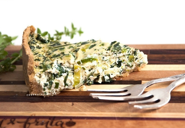 O espinafre é um vegetal com rico valor nutricional e o sabor combina bastante com o alho-poró, pois eles se complementam. Essa é uma receita saudável, sem glúten, sem leite e sem ovos, bem cremosa. A massa é feita com farinha de arroz integral, polvilho doce, farinha de linhaça, azeite de oliva, água e sal. O recheio leva espinafres, alho-poró, tofu, limão, sal, azeite e fermento.