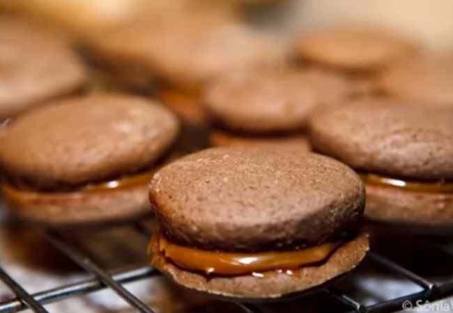 Se não quiser passar o trabalho de fazer uma cobertura de chocolate derretido, não precisa. Seus alfajores vão ficar igualmente maravilhosos com coco ralado em volta. Essa versão é feita com uma massa mais fininha à base de trigo, amido, sal, fermento, bicarbonato, manteiga, açúcar, gemas, baunilha e raspas de limão. Veja como fazer a montagem: