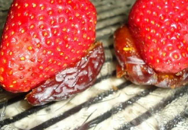 Mais uma sobremesa que fica deliciosa e é muito fácil de fazer. Só vai precisar de tâmaras frescas e morangos. As tâmaras servem como “caminhas” para os morangos e se quiser pode servir com creme de leite.