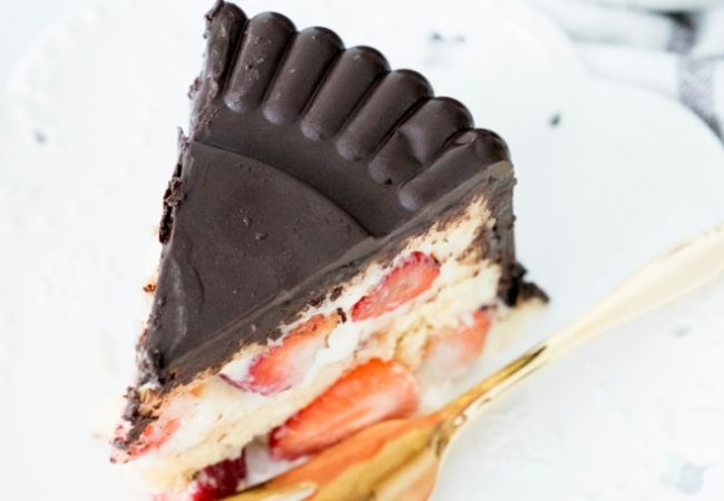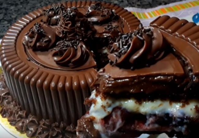 A receita mais popular desse bolo é feita com recheio de creme de morango, afinal de contas, morango e chocolate formam uma das mais perfeitas combinações de sabores doces. Essa versão é com uma camada de chocolate crocante que faz o bolo realmente se parecer com um bombom tamanho família.