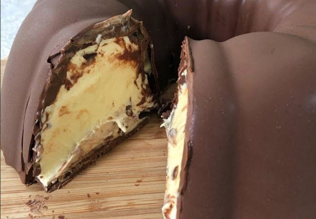 Quer preparar um bolo bem cremoso, sem massa, com poucos ingredientes, lindo de se ver e delicioso? Essa opção com sabor de leite Ninho é simplesmente incrível. Para fazer o bolo, que não leva massa, você só vai precisar de leite Ninho, claras e açúcar demerara. No mais, só vai precisar derreter chocolate para fazer a crostinha de bombom na cobertura.