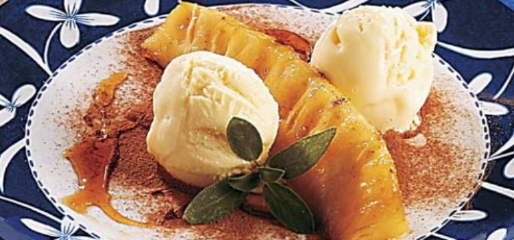 - Coloque as duas rodelas de abacaxi em um recipiente que possa ir ao forno, polvilhe a canela por cima, leve para dourar por alguns minutos, sem que resseque, apenas para ficar crocante;
