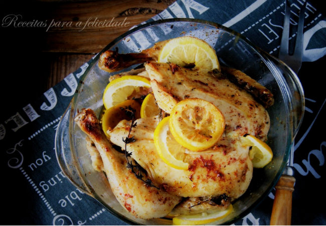 - Coloque o frango num pirex (peitos virados para baixo). Tempere de sal e com o suco de um limão. Coloque depois as partes do limão espremidas dentro do peito do frango.