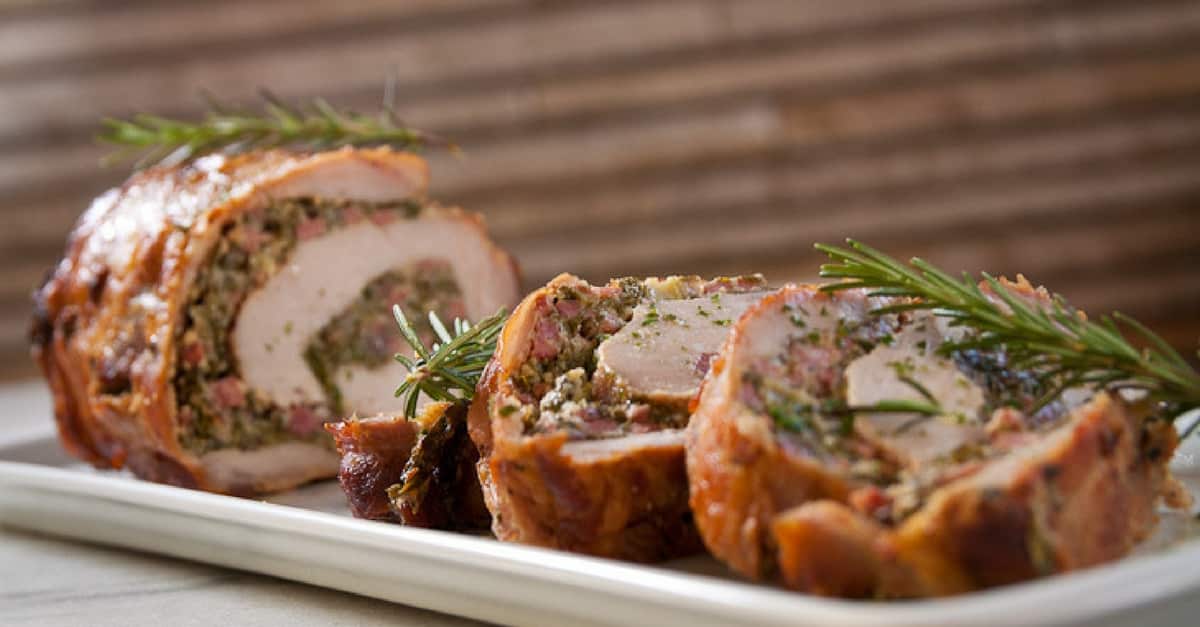 3. Depois desse tempo, recheie com as tiras de bacon a ameixa e o abacaxi, feche, e amarre com um barbante para garantir que está bem preso.