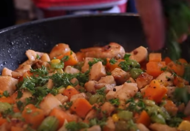 Para o dia em que um peito de frango em cubinhos com vegetais coloridos for suficiente, essa receita é perfeita. A sugestão de vegetais é cenoura, vagem e milho, para ser bem prático, mas você pode adicionar outros, como brócolis, couve-flor e alho-poró, por exemplo.