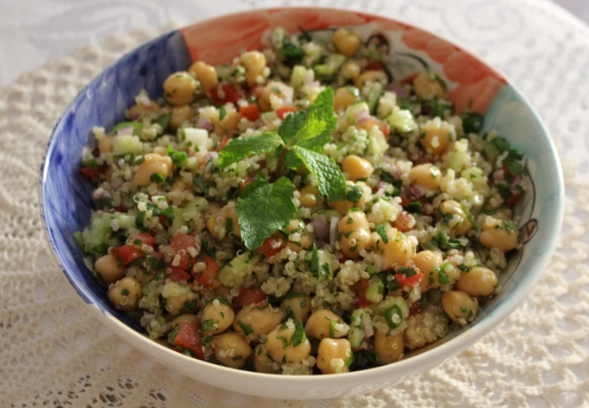 Em apenas 20 minutos você prepara essa marmita colorida, deliciosa e absolutamente nutritiva. Se quiser incrementar o tabule pode acompanhar com purê de batata-doce e batata baroa com leite de coco. Um almoço maravilhoso e completo.