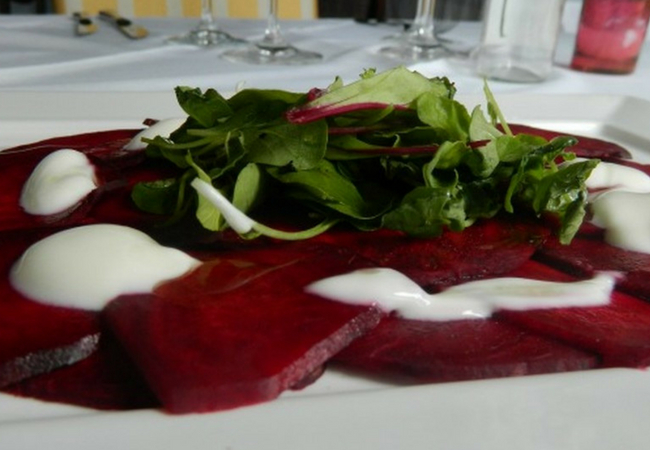 Bem diferente do comum, ela leva beterraba, trigo sarraceno (tipo de cereal sem glúten), laranja, manjericão e pimenta preta. Também tem, para a mesma receita, uma forma de fazer queijo tipo feta, que leva sementes de girassol, alho, suco de limão, água, levedura de cerveja, manjericão e pimenta.