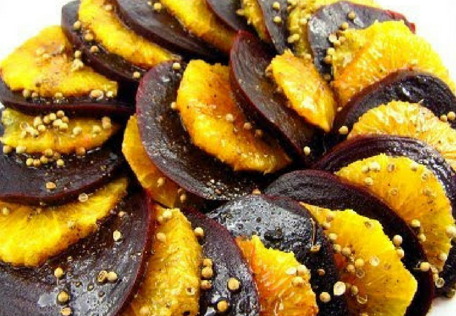 O suco de beterraba com laranja é delicioso, então, por que não fazer uma salada com essa mesma combinação? A receita leva beterraba cozida em rodelas, laranjas frescas, coentros e um vinagrete para temperar.