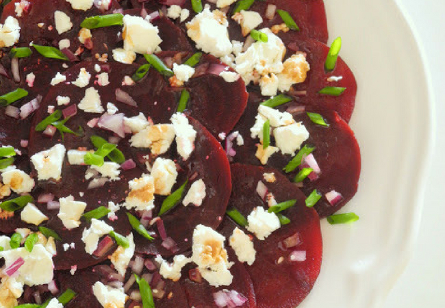 O queijo tipo feta fica ótimo para compor saladas, assim como os demais ingredientes, que são cebola roxa picadinha e cebolinha para agregar ainda mais sabor. Para temperar a salada de beterraba, uma mistura de azeite, sal e vinagre balsâmico. Um leve e delicioso sabor agridoce.