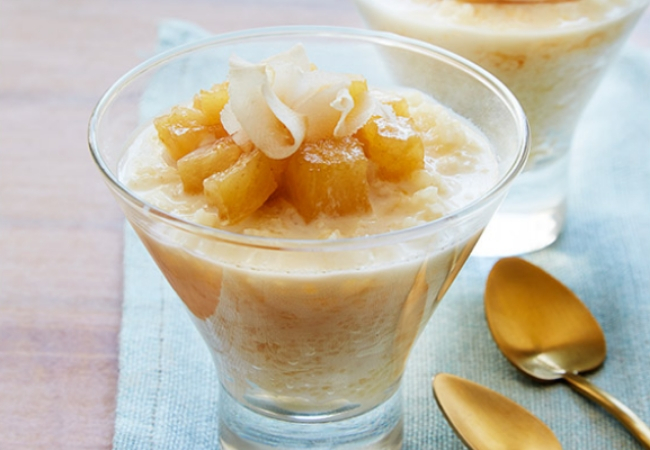 Outra forma de fazer e de servir o abacaxi caramelado é sobre um delicioso creme de tapioca feito com leite de coco, leite líquido, leite condensado e tapioca granulada. O abacaxi é feito com manteiga e açúcar, mas pode adicionar um toque de canela, se gostar.
