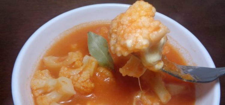 - Na gordura que sobrou, frite a cebola até dourar, adicione o alho, a couve-flor e os temperos. Cubra com água e deixe cozinhar;
