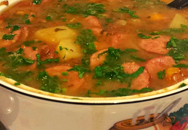 Essa opção é quase uma feijoada, mas que usa a lentilha no lugar do feijão. Como leva muitos ingredientes é um ótimo prato principal para o almoço. Essa sopa é feita com lentilhas, batatas, cenoura, linguiça calabresa, pimenta, sal, manjericão, cheiro-verde, cebola, alho e azeite.